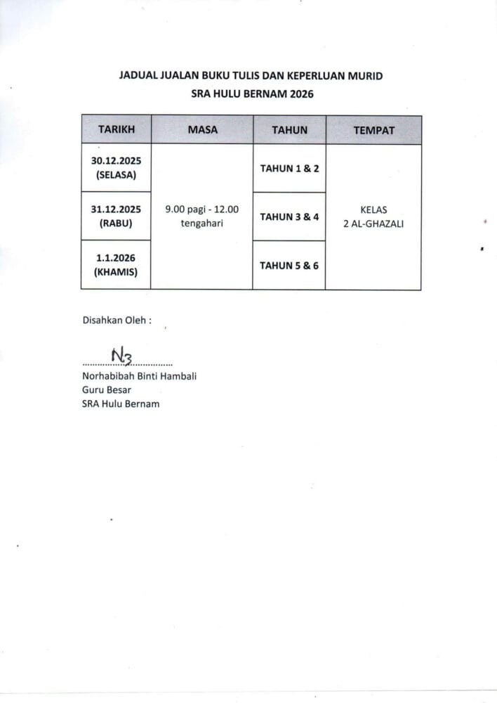 Assalamualaikum kepada semua ibubapa murid SRA Hulu Bernam.